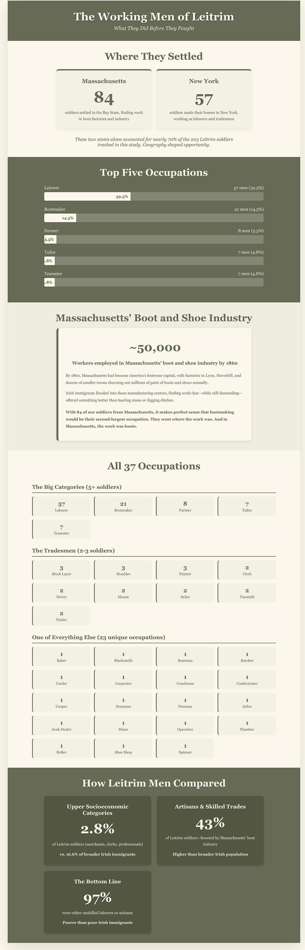 The one category where Leitrim men exceeded their peers? Artisans. That 40.5% figure—boosted significantly by the Massachusetts boot and shoe industry—was actually higher than the broader Irish immigrant population. Without Massachusetts' factories, that number would have been far lower, and Leitrim's soldiers would have looked even more economically desperate.​